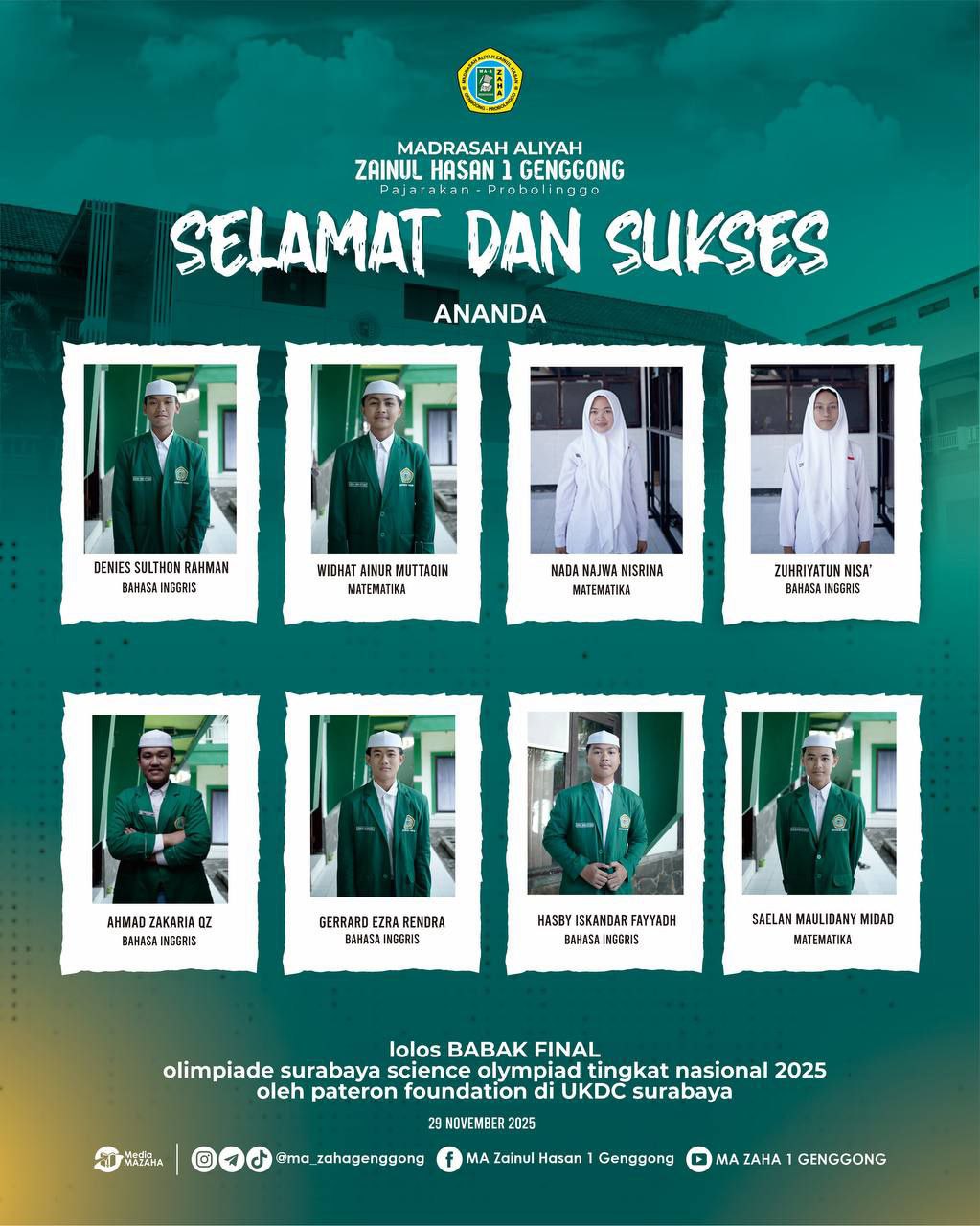 Selamat dan Sukses 1. Saelan Maulidany Midad (Matematika) 2. Syafiqa Alviatul Janah (Fisika) 3. Naila Cahya Firdausy (Fisika) 4. Putri Bunga Lestari (Fisika) 5. Herlina Winda Fusvita (Fisika) 6. Moh. Robit Itsnaini 'Ilman (Fisika) 7. Elok Nisrina Zaharani (Fisika) 8. Ulqia Maulida Hasana (Kimia) 9. Nayfal Alif Azzamul Haq (Kimia) 10. Nur Fadilah Fidotul Jannah (Kimia) 11. Nadya Naqsabandiyah (Kimia) 12. Syarofah Khilfina (Geografi) 13. Ahmad Humaidi Abdillah (Geografi) 14. Muhammad Ikbalus Surur (Geografi) 15. Muhammad Guntur Satya Nugroho (Geografi) 16. Fika Nuril Kamilatin Romy (Ekonomi) 17. Abdul Haris (Ekonomi) 18. Aghistna Biroisirroihan (Ekonomi) Lolos SEMIFINAL RAYON Olimpiade Sosial-Science Air-Langga Competition Tingkat Nasional UNAIR 2025 di Probolinggo (18 Oktober 2025)
